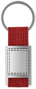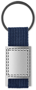 Rektangulär nyckelring i metall och färgat polyesterväv.