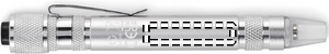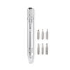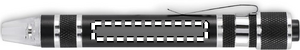 Multiverktyg i återvunnen aluminium i pennform med ficklampa. Innehåller 3 spårskruvmejslar och 3 stjärnskruvmejslar. 4 knappcellsbatterier LR41 ingår.