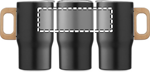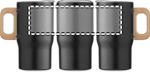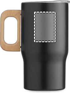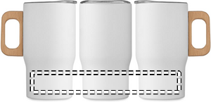 Dubbelväggig mugg i återvunnet rostfritt stål (90% återvunnet rostfritt stål och 10% rostfritt stål) med trähandtag och lock. Volym: 350 ml. Läckagefri.