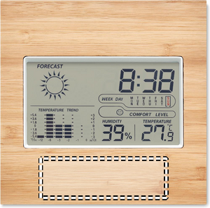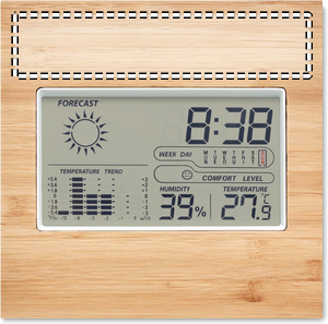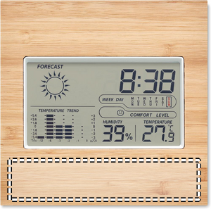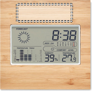 Väderstation med bambufront, multifunktionell termometer. Funktioner: klocka, temperatur, luftfuktighet och kalender. 2 AAA-batterier ingår inte. Bambu är en naturligt material och det kan finnas små variationer i färg och storlek, vilket kan påverka märkningen.