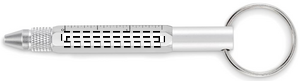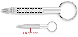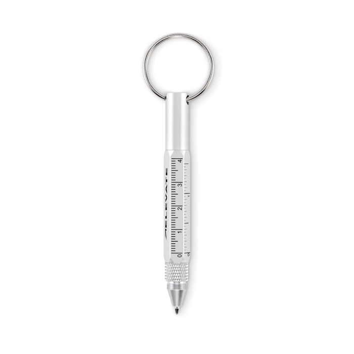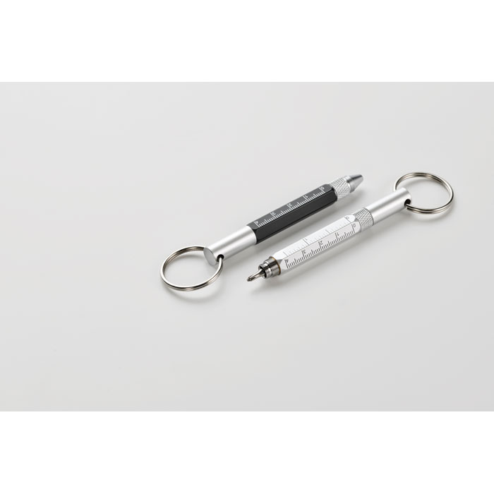 Nyckelring med vridbar penna i återvunnen aluminium med linjal 4 cm och 1,5 tum, stiftpenna och 2 i 1 skruvmejsel med phillips- och platt huvud. Svart bläck.