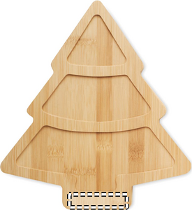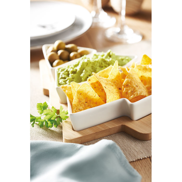 Trädformat serveringsfat i bambu med tre serveringsfat i keramik. Servera snacks, ostar och annan läcker mat på det här naturliga serveringsbrädet. Presentera fatet och de keramiska tallrikarna som en helhet eller separera dem för att servera ännu mer mat.