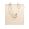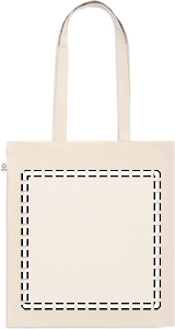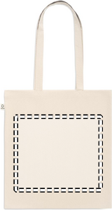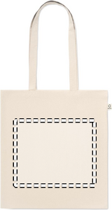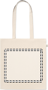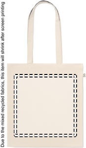 Kasse av återvunnen bomull (70% återvunnen bomull och 30% RPET) med långa handtag. 140 gr/m². Ur ett hållbarhetsperspektiv är detta material väldigt fördelaktigt.