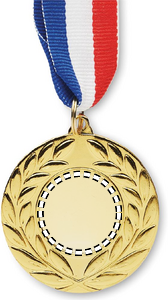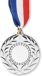 Medalj av järn med polyesterband i färgerna blått, vitt och rött. 5 cm i diameter