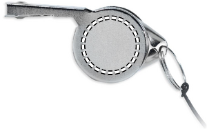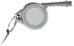 Metall visselpipa fäst vid snodd med säkerhetsspänne.
